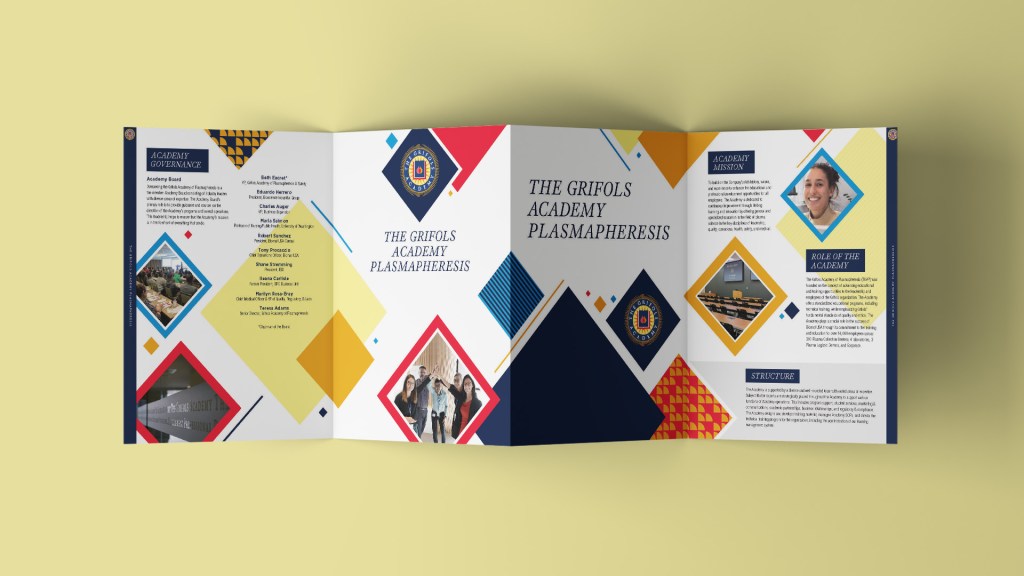 While the catalog served as a great resource for active or interested students, the academy was equally interested in attracting new students that may be unaware of this offering. The pamphlet became the perfect solution. With a unique quad fold design this eye catching design was distributed around various Grifols offices.