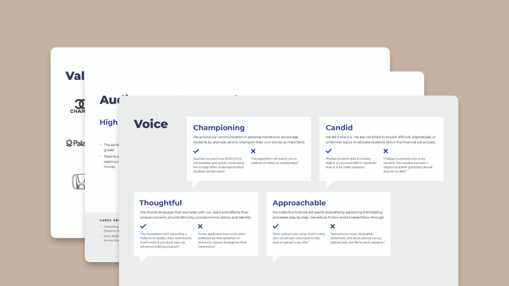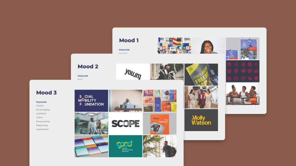 We use the brand discovery as our guideposts to create 3 moodboards for the client. These represent the various directions we see the brand going and give clients a visual without needing the final branded elements which allows us to iterate quickly.